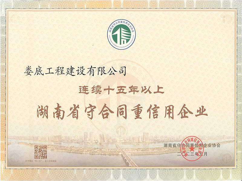 2022年度連續十五年以上湖南省守合同重信用企業榮譽證書