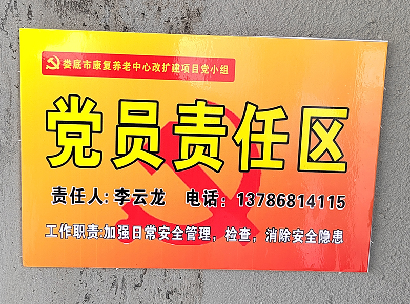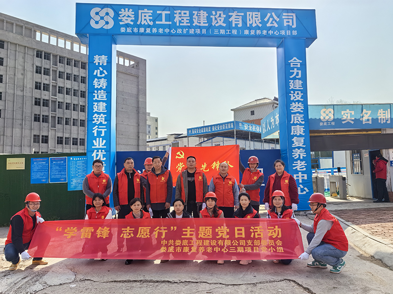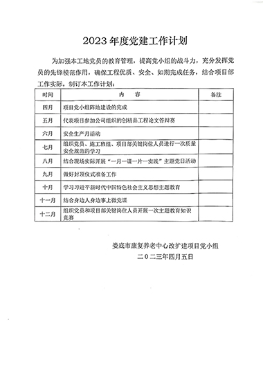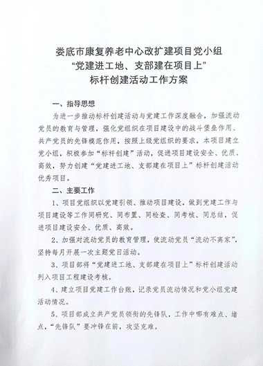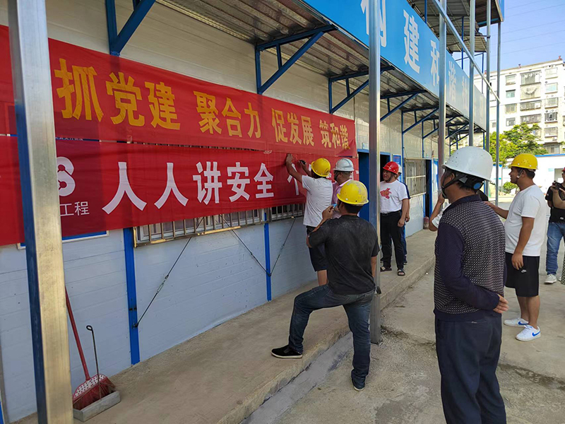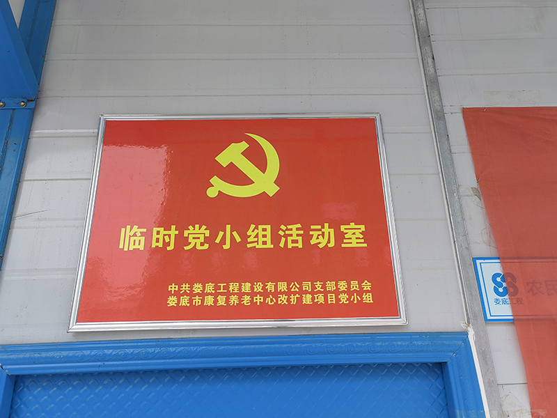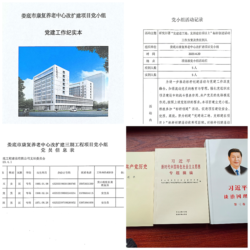 公司黨支部秉承“抓黨建就是抓生產力”的理念,全力推進“黨建進工地、支部建在項目上”標桿創建活動努力實現“生產一線有黨員、業務骨干是黨員、關鍵時刻看黨員”的工作目標。2023年4月1日成立婁底市康復養老中心改擴建項目黨小組,現有正式黨員3名。項目部設有專門的黨建活動場所,黨組織標識牌、黨旗、入黨誓詞等全部設置在顯目位置。場外設置了專門的黨建宣傳欄。