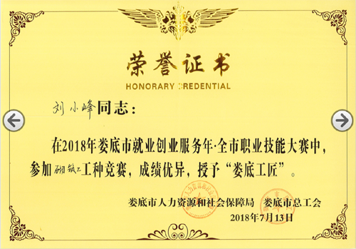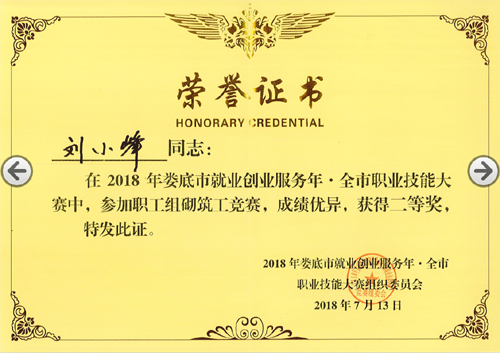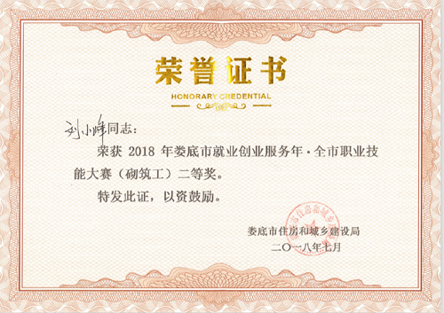 2018年7月13日,由婁底市人力資源和社會(huì)保障局、婁底市總工會(huì)、婁底市住房和城鄉(xiāng)建設(shè)局主辦的“2018年婁底市就業(yè)創(chuàng)業(yè)服務(wù)年.全市職業(yè)技能大賽”圓滿落幕。我公司選送的參賽選手劉小峰獲職工組砌筑工競(jìng)賽二等獎(jiǎng),并被授予“婁底工匠”。