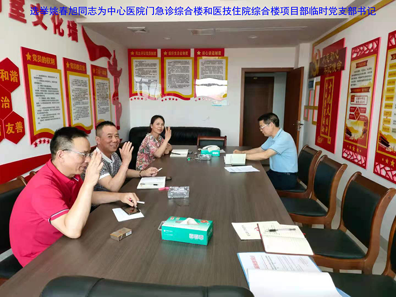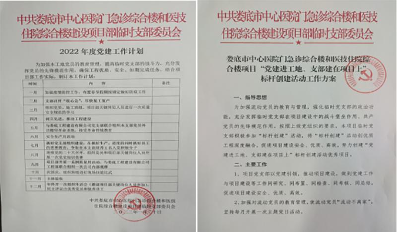該項目地處婁底市最繁華街道的十字路口,又是婁底市最大的單體建筑公共項目。項目中標(biāo)后,公司立即配備優(yōu)秀骨干組建項目部班子,并成立了中共婁底市中心醫(yī)院門急診綜合樓和醫(yī)技住院綜合樓建設(shè)項目部臨時支部委員會,推舉項目經(jīng)理姚春旭擔(dān)任臨時黨支部書記,并安排了黨建指導(dǎo)員。該支部目前有黨員8人。項目部設(shè)置了黨員活動室,文化走廊等,臨時黨支部“五化”建設(shè)達(dá)標(biāo)。